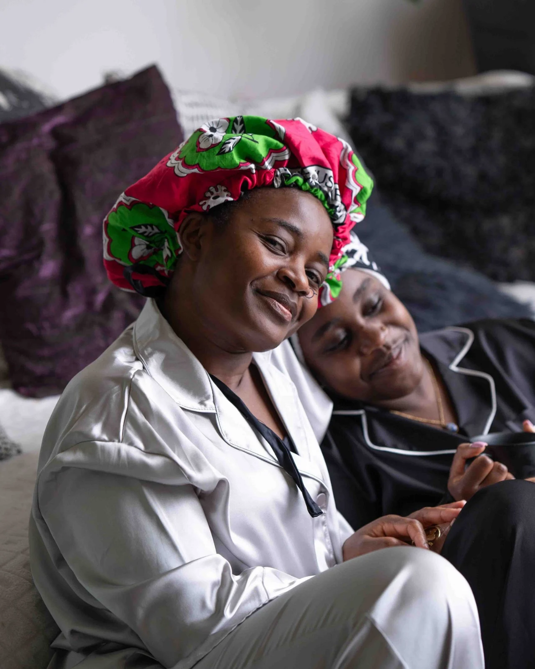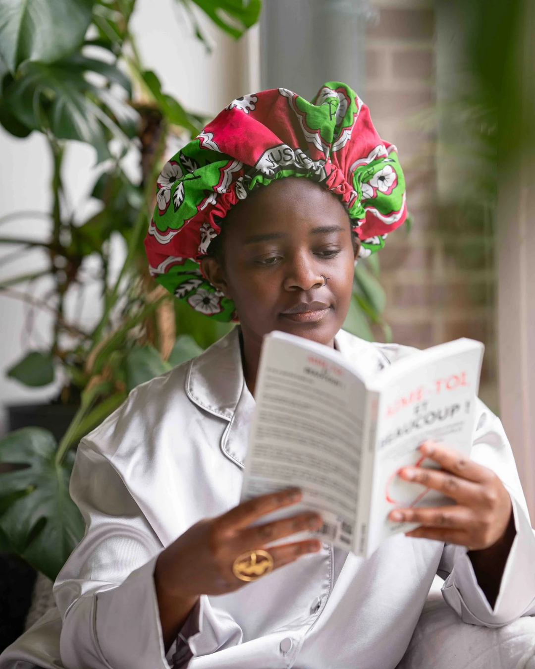 Confectionné en tissu Kanga authentique et doublé d’un satin ultra-doux, il est conçu pour préserver la santé, l’hydratation et la beauté de ta couronne de jour comme de nuit.
